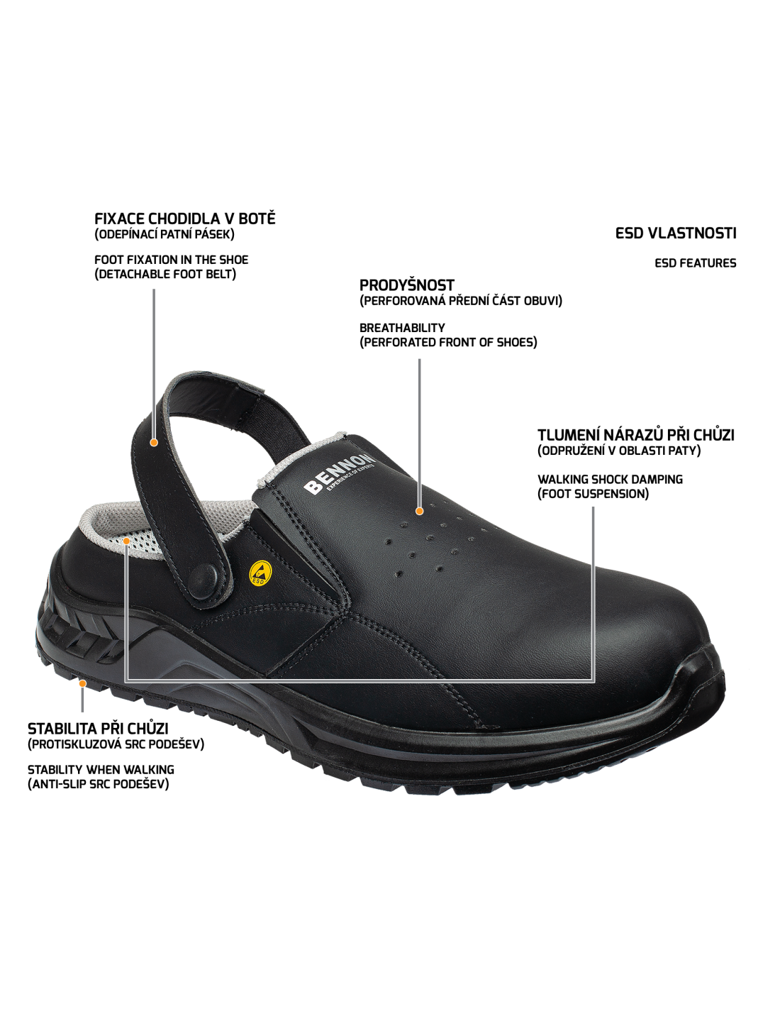 Bardzo trwały but roboczy, o właściwościach antystatycznych, ESD, nieposiadający elementów metalowych, dobrze zmywalny; odpowiedni dla hotelarstwa, gastronomii, strefy EPA itp. But zawiera pasek na pięcie, który umożliwia lepsze dopasowowanie, istnieje możliwość jego odpięcia, jeśli nie jest potrzebny. Przednia część tego buta jest perforowana, co wraz z antybakteryjną wkładką sprawi, że stopy będą dłużej świeże. Pod względem bezpieczeństwa dużą zaletą jest tutaj antypoślizgowa właściwość SRC podeszwy i amortyzacja w okolicy pięty, która niweluje wstrząsy, a tym samym chronia stawy i mięśnie stóp.