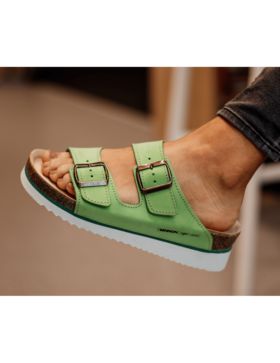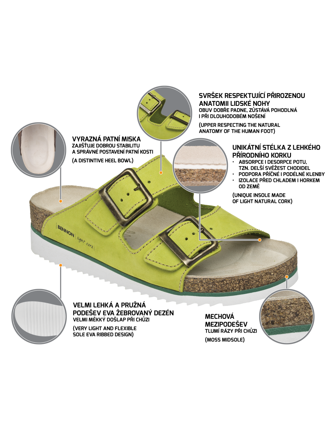 Lekkie, bardzo wygodne buty z miękką podeszwą z naturalnego korka. Anatomicznie wyprofilowana korkowa platforma w naturalny sposób wspiera piętę i imituje kształt stopy, zapewniając dobrą stabilność i komfort podczas długotrwałego noszenia. Skórzana wkładka wewnątrz zapewnia wysoka absorpcję i desorpcję potu. Międzypodeszwa z zielonego EVA skutecznie amortyzuje wstrząsy podczas chodzenia. Podeszwa z EVA przyczynia się do niskiej wagi oraz wysokiej odporności na ścieranie. Doskonałe do codziennego noszenia.
