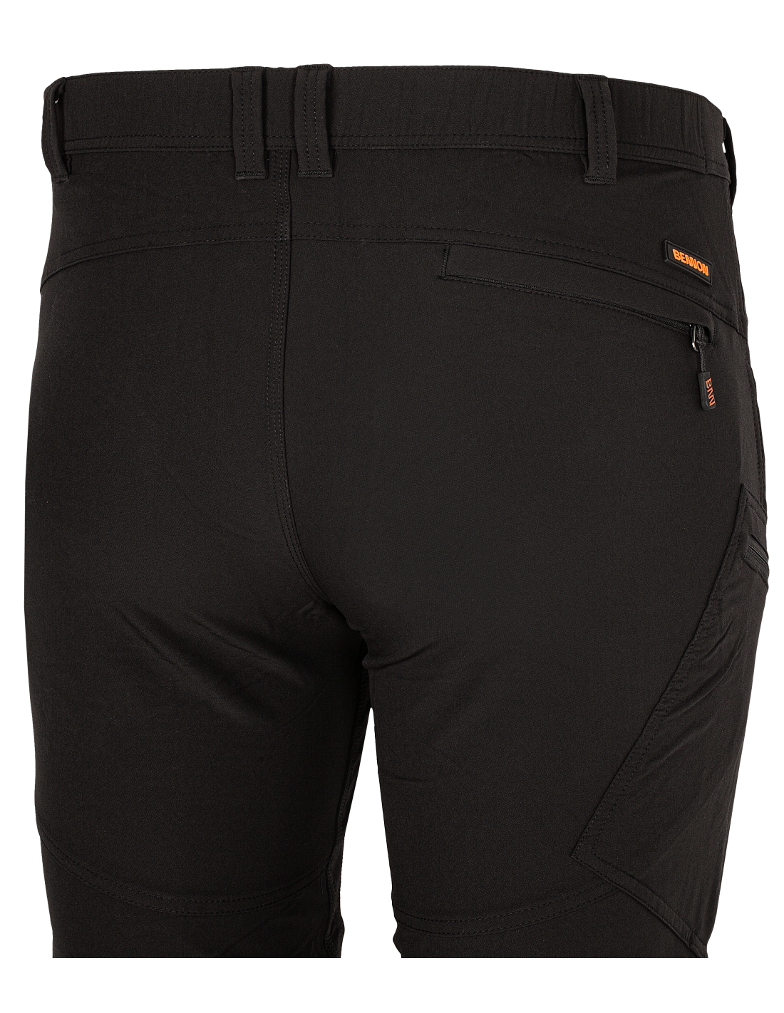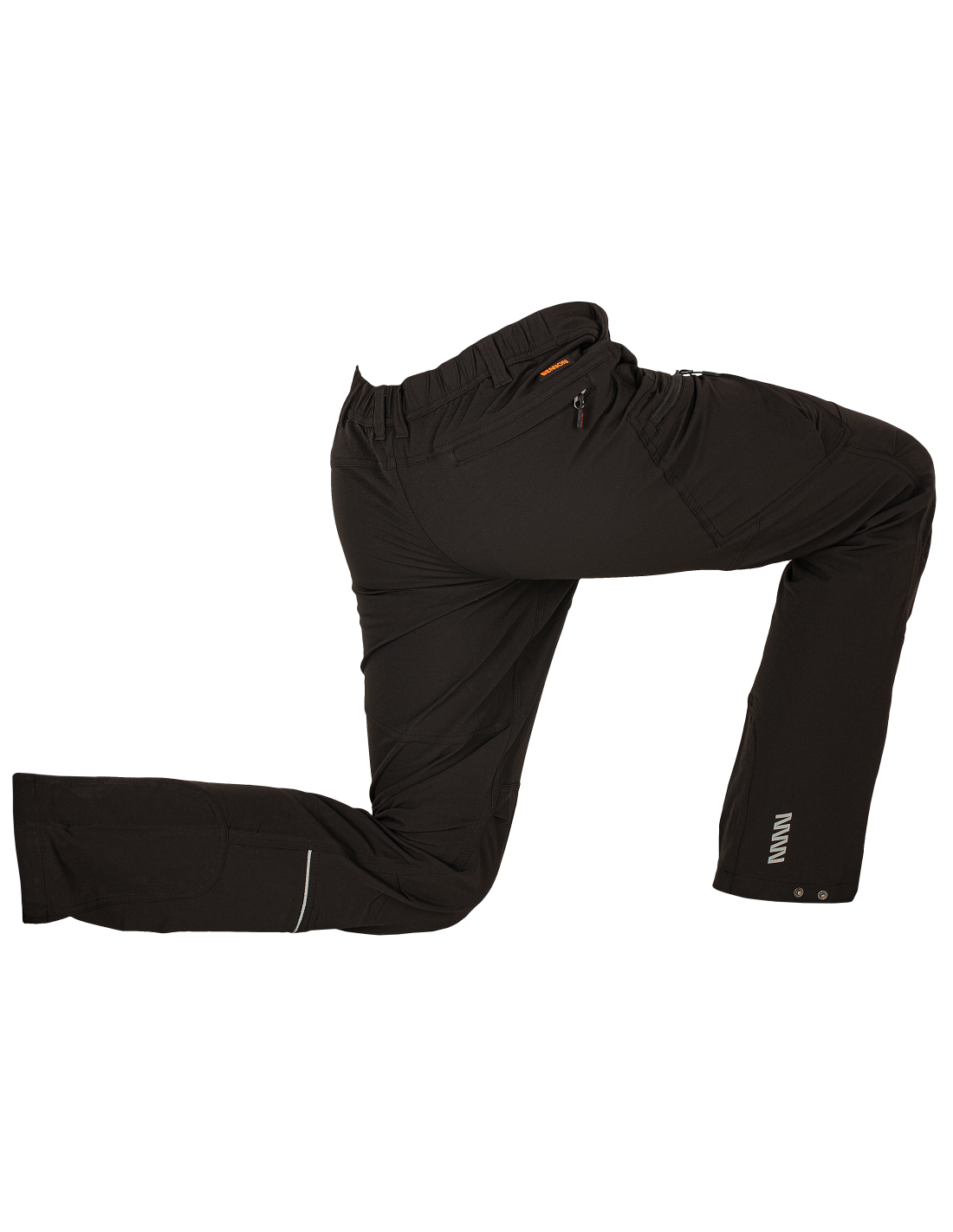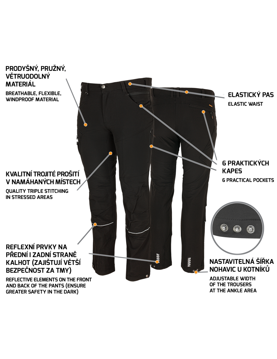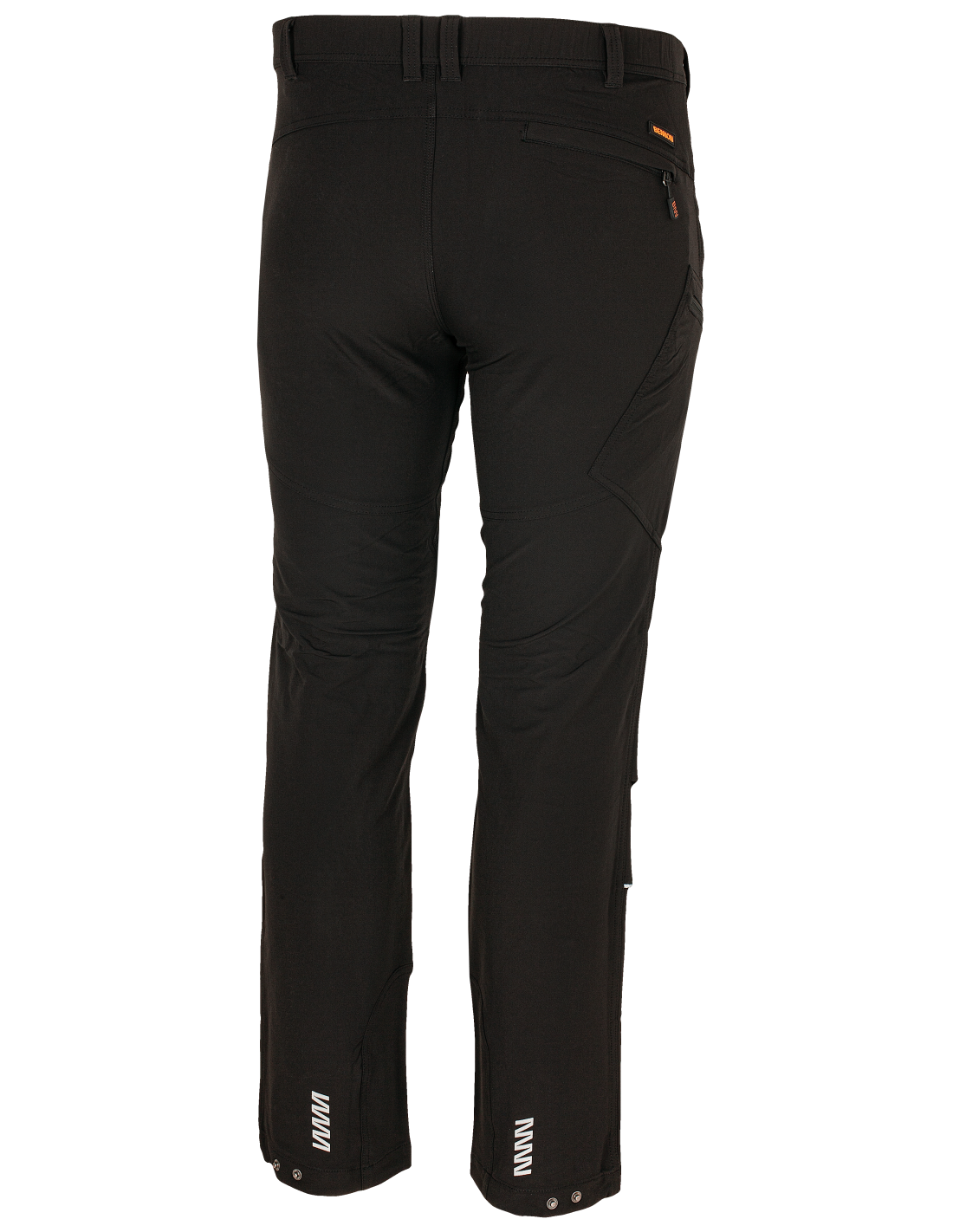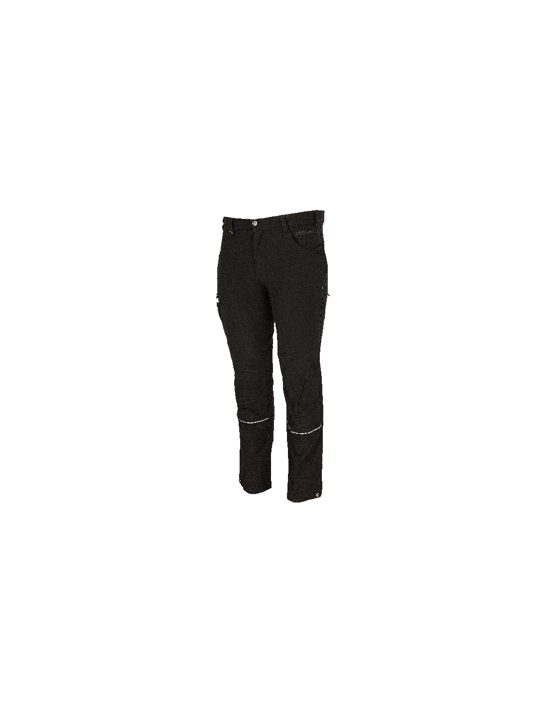 Spodnie outdoorowe funkcjonalne outdoorowe spodnie z elastycznego materiału zapinane kieszenie po bokach i z tyłu elastyczny pas elementy odblaskowe potrójne szwy w strefach zginania regulowana szerokość nogawek spodni Kolor: czarny z elementami odblaskowymi