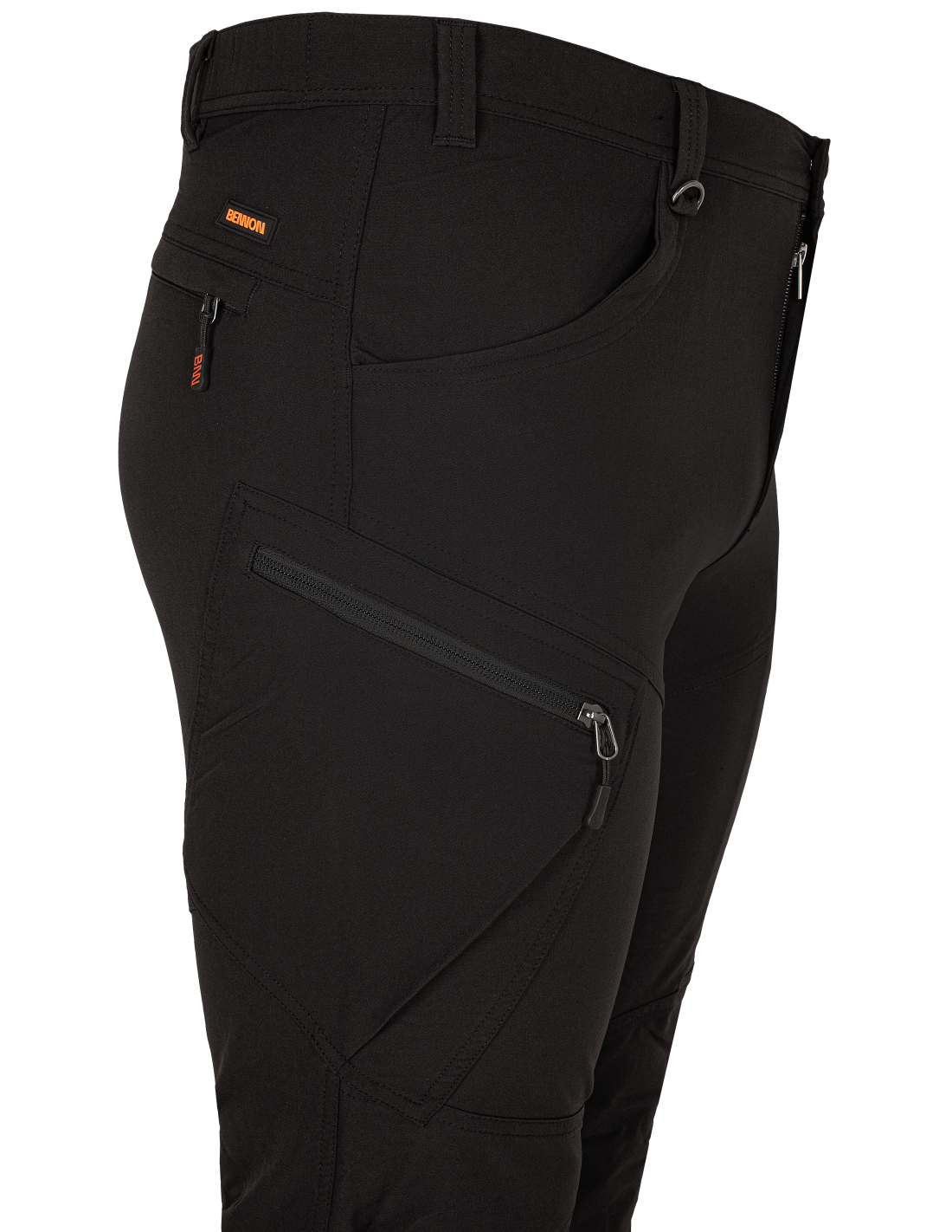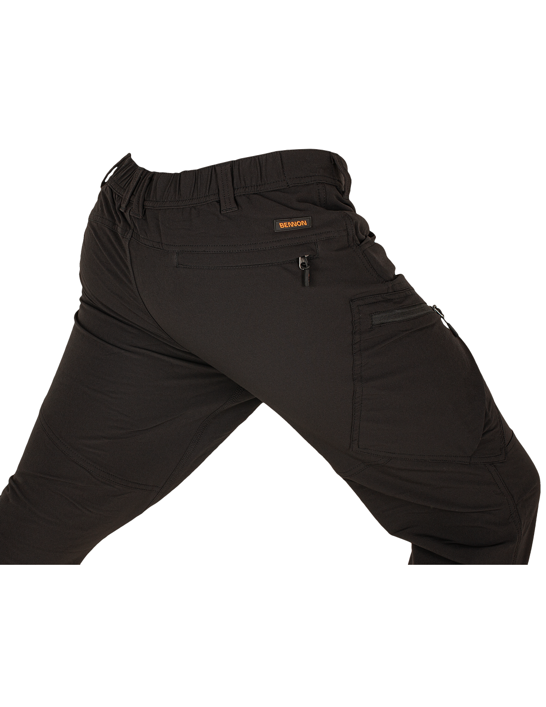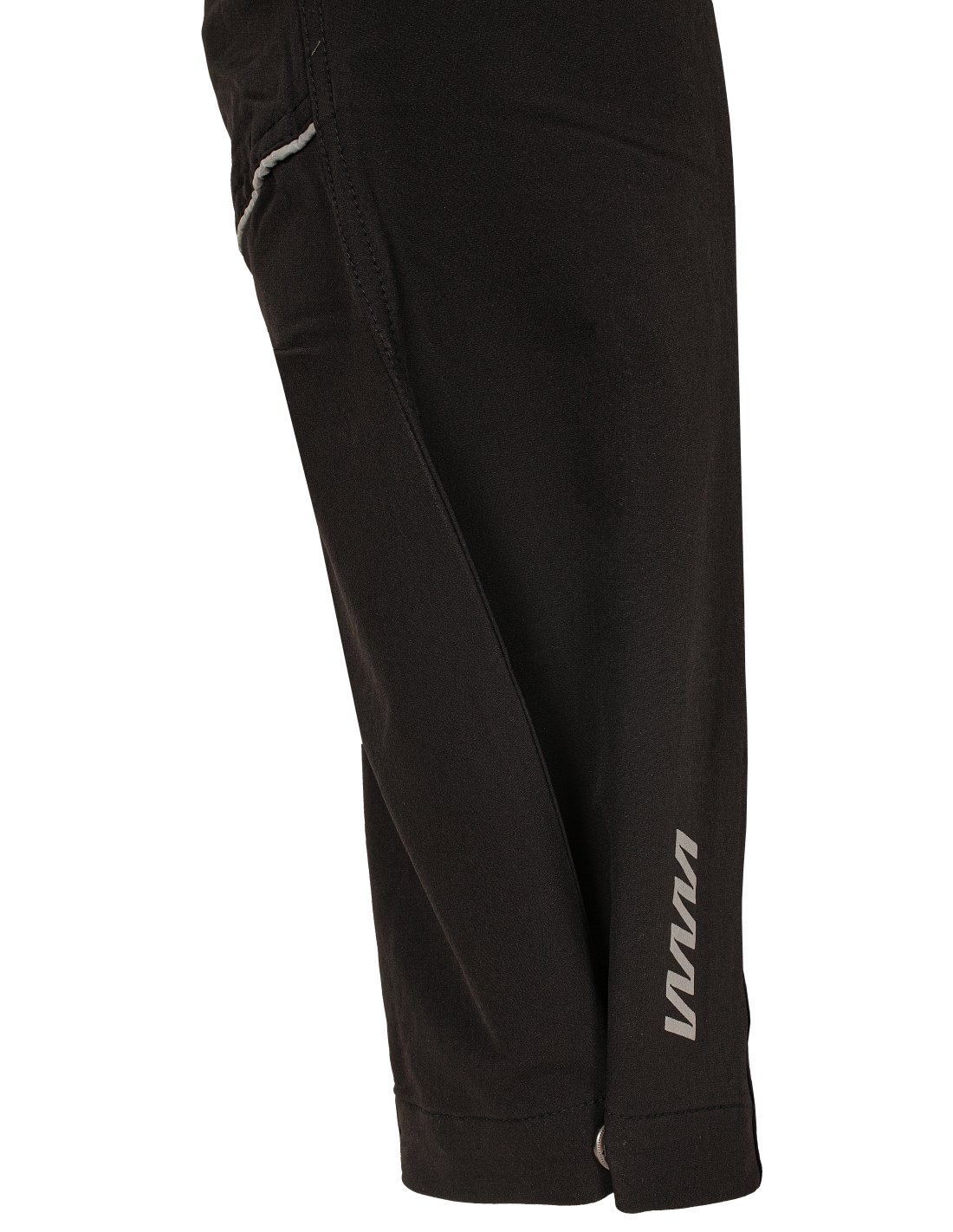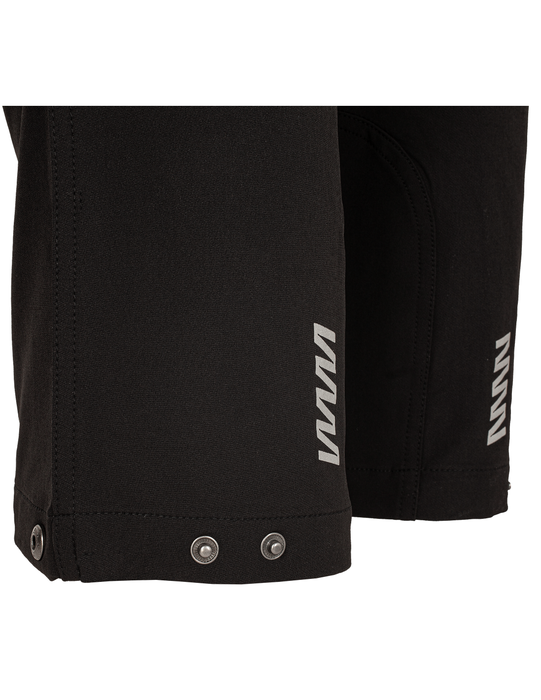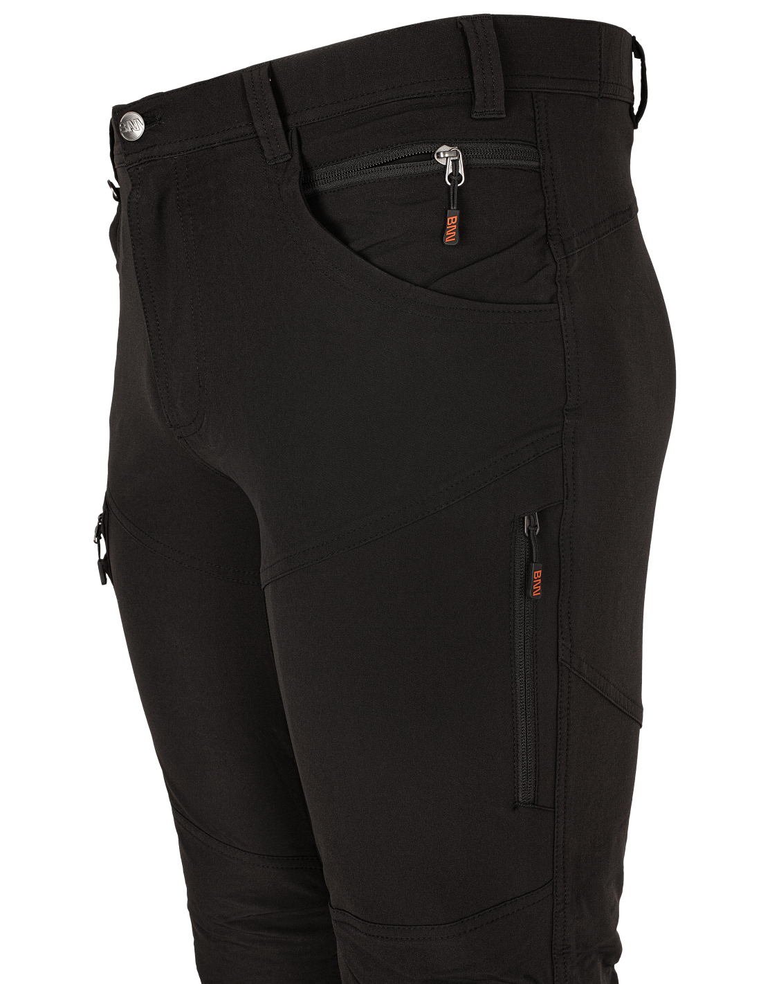 Spodnie outdoorowe funkcjonalne outdoorowe spodnie z elastycznego materiału zapinane kieszenie po bokach i z tyłu elastyczny pas elementy odblaskowe potrójne szwy w strefach zginania regulowana szerokość nogawek spodni Kolor: czarny z elementami odblaskowymi