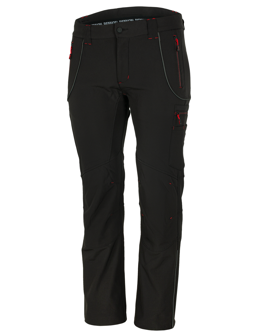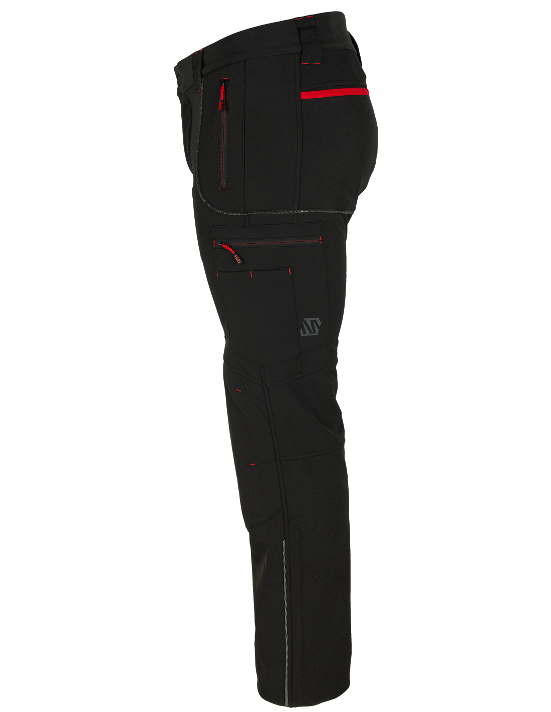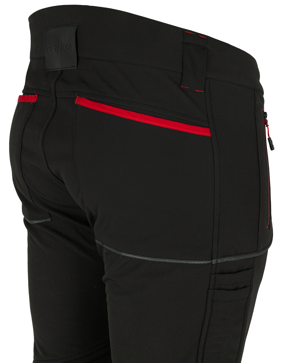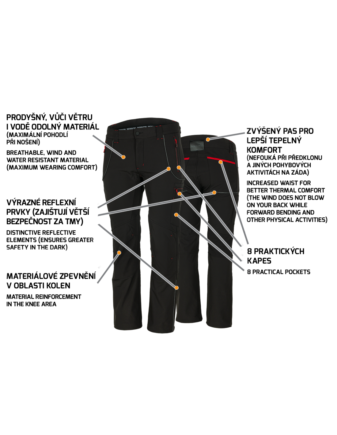 Ocieplane spodnie softshellowe wodoodporny i wiatroodporny materiał (idealny w chłodne dni) przepuszczalność pary 15 000 g/m2/24h z wysoką oddychalnością charakterystyczne elementy odblaskowe wzdłuż linii kieszeni z przodu i z tyłu spodni (lepsza widoczność w ciemności i w nocy) podwyższona talia dla lepszego komfortu termicznego (nie wieje po plecach podczas schylania się i innych aktywności fizycznych) szerokie szlufki na pasek 2 przednie kieszenie na suwak, 2 tylne kieszenie, 1 boczna kieszeń na suwak, trzy mniejsze boczne kieszenie na drobiazgi wzmocniony materiał  w okolicach kolan
