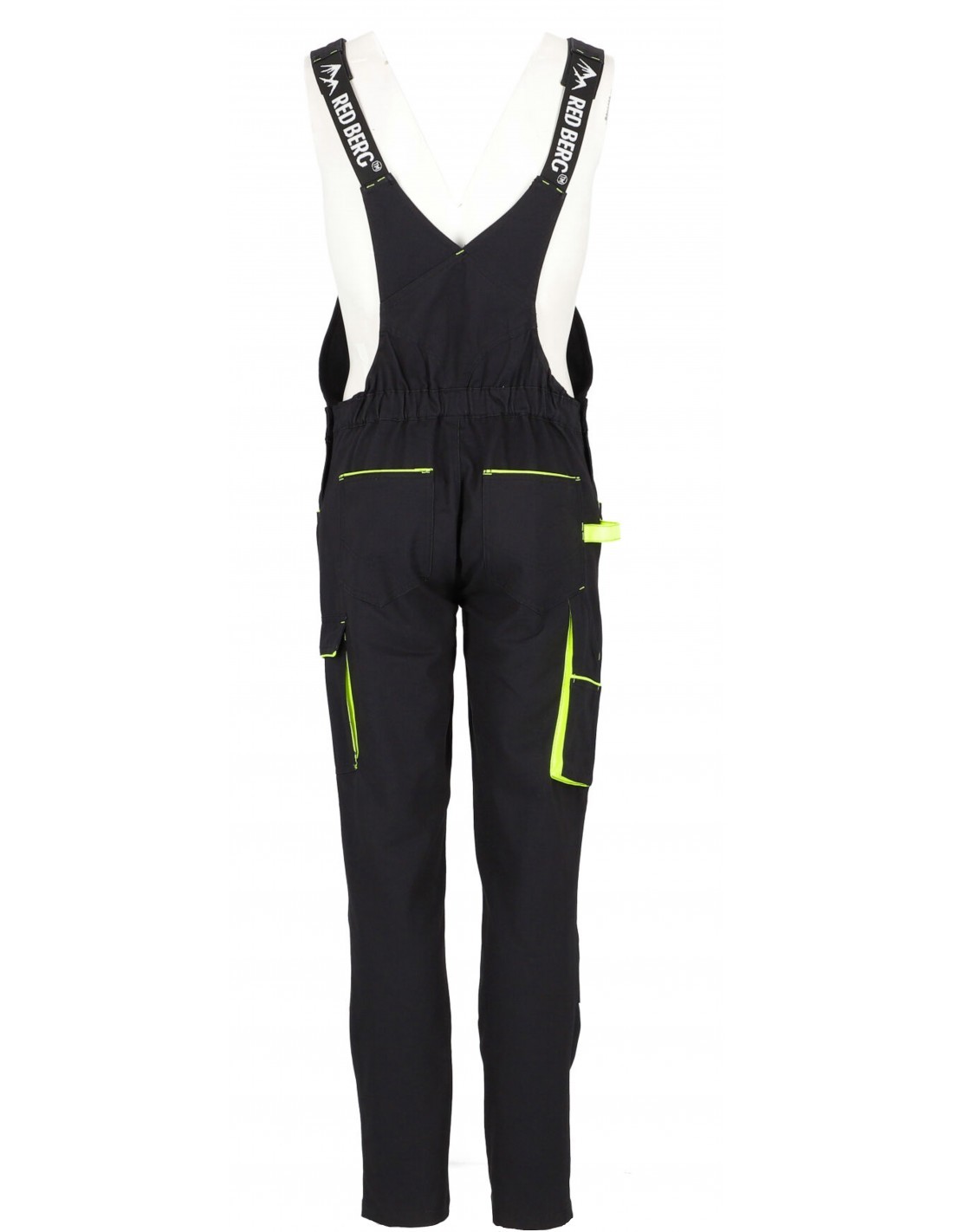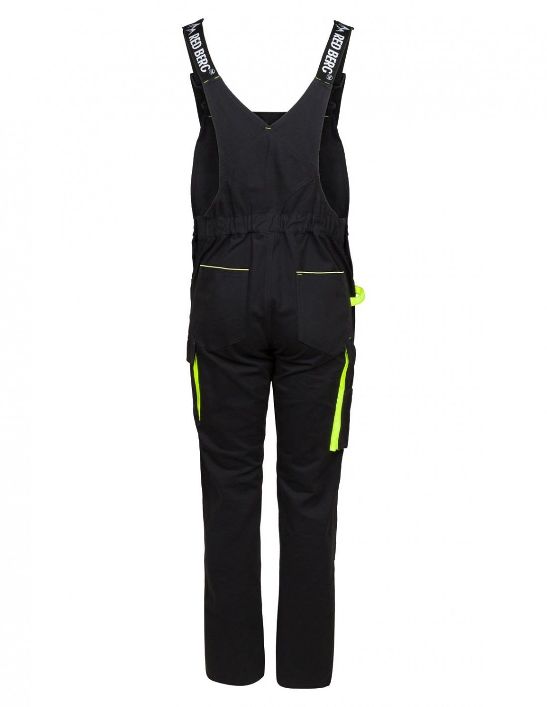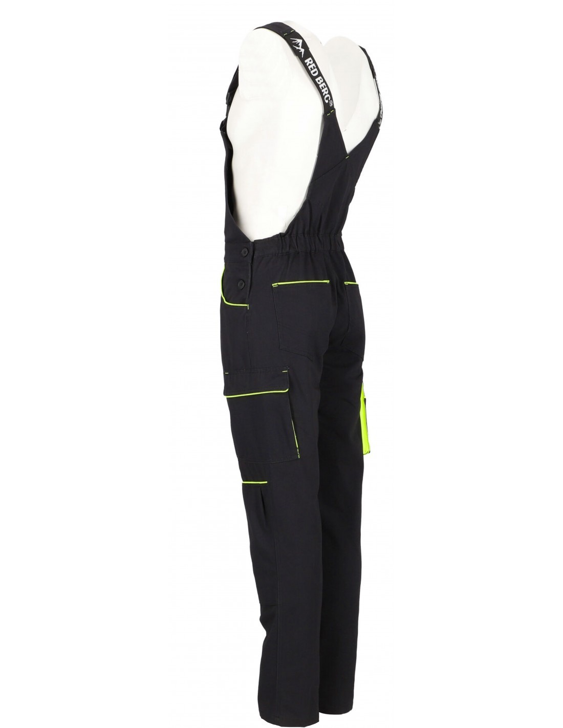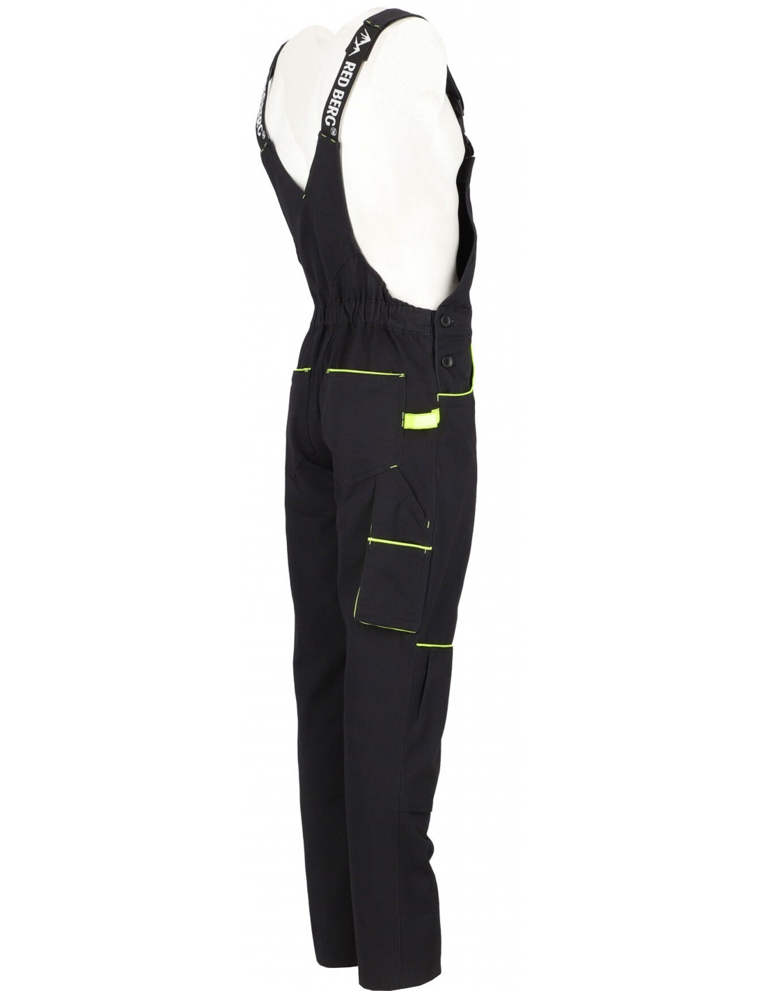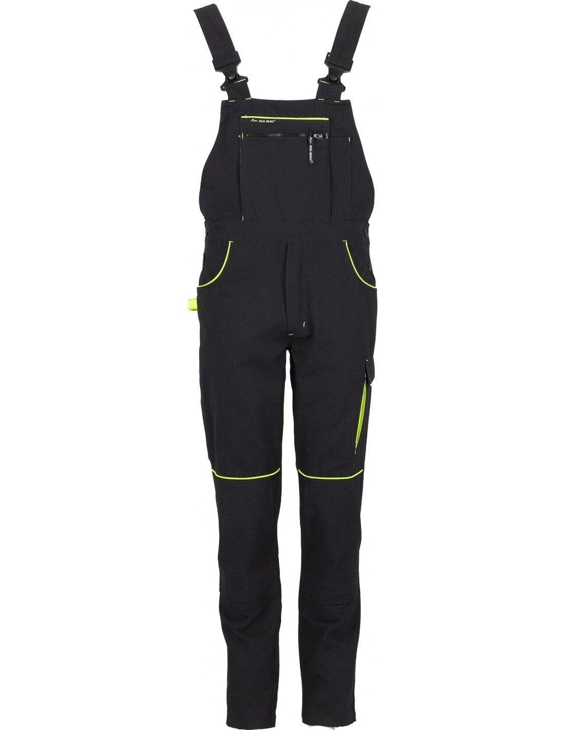 Spodnie ogrodniczki robocze-ochronne w kolorze czarnym niebrudzącym wraz z estetycznymi żółtymi-seledynowymi wstawkami w kieszeniach przestrzennych. Posiadają dwie płaskie kieszenie z tyłu, dwie kieszenie boczne, dużą kieszeń przestrzenną na udzie zapinana na patkę, na klatce piersiowej dużą kieszeń na dokumenty, zapinaną na zamek, podwójną kieszeń ma miarkę i szlufkę na narzędzia.