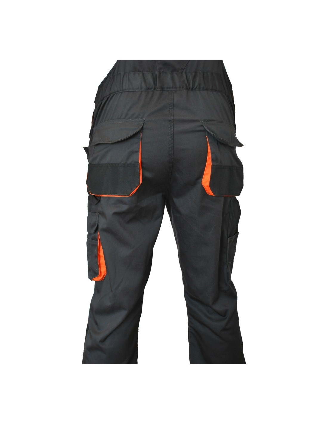 Spodnie robocze-ochronne w kolorze grafitowym, niebrudzącym wraz z estetycznymi pomarańczowymi wstawkami w kieszeniach przestrzennych. Posiadają dużą kieszeń na klatce piersiowej zapinaną na zamek, dwie przestrzenne kieszenie z tyłu zapinane na patkę, dwie przestrzenne kieszenie boczne, dużą kieszeń przestrzenną na udzie zapinaną na patkę, podwójna kieszeń ma miarkę i szlufkę na narzędzia.