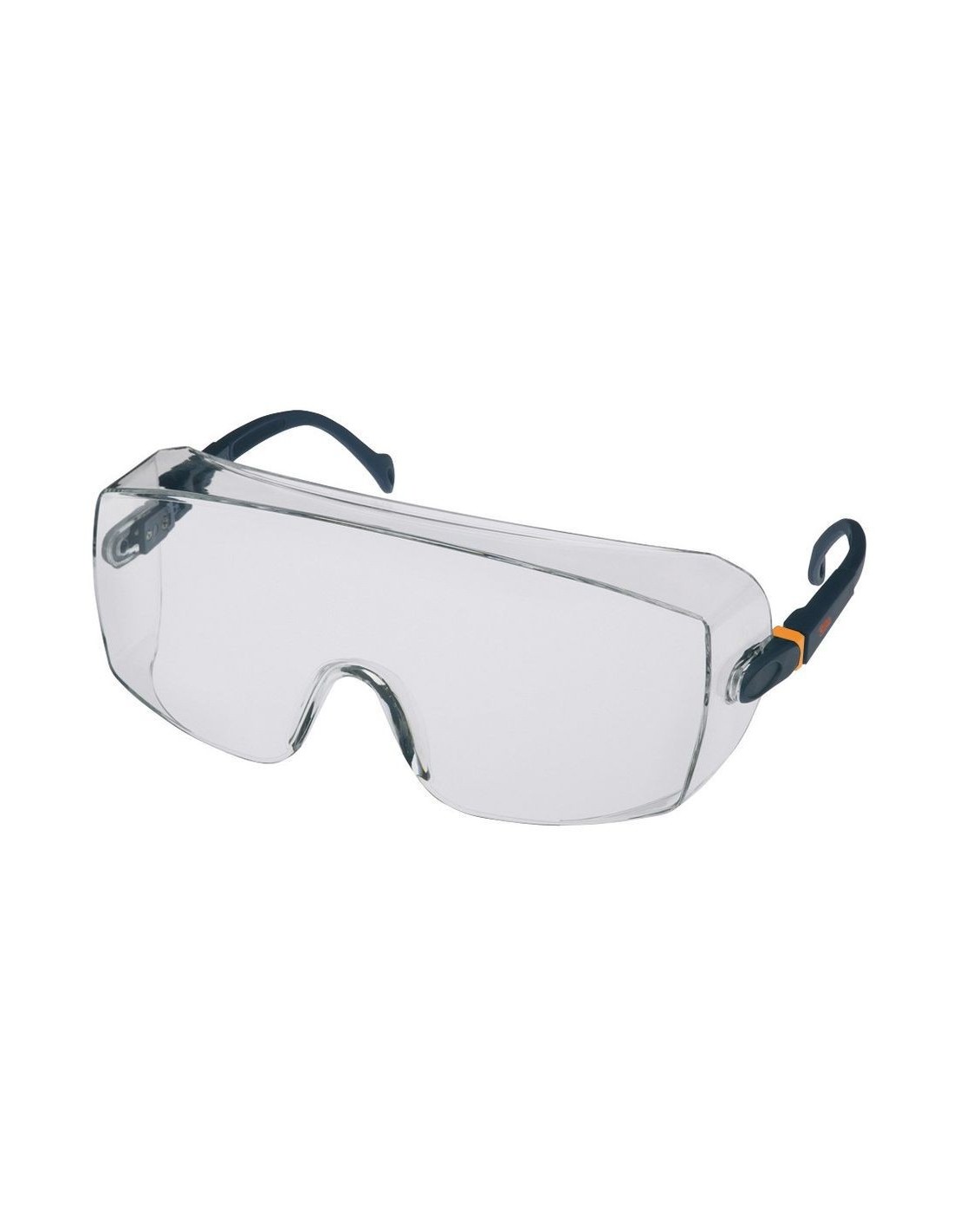 Okulary ochronne zakładane na okulary korekcyjne. Nie kolidują z większością okularów korekcyjnych. Ciemnoniebieska oprawa, bezbarwne soczewki.