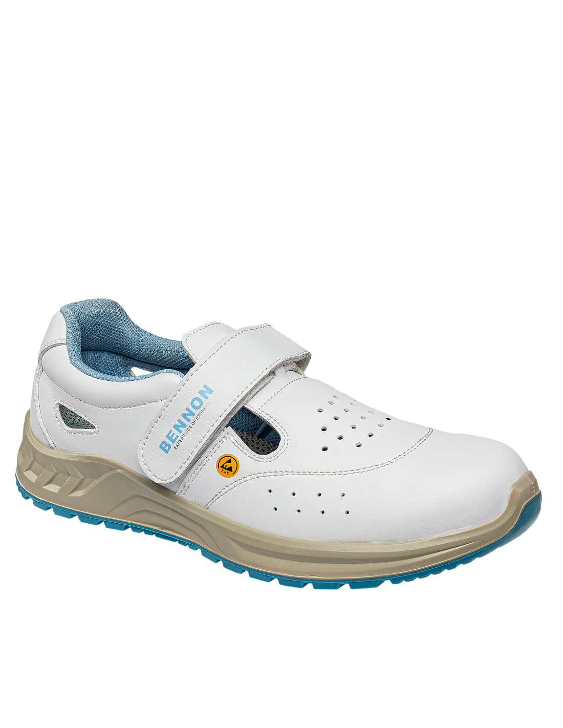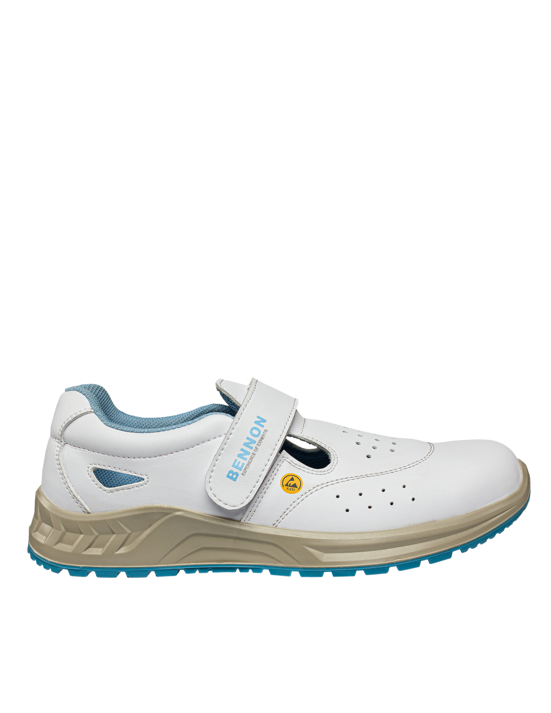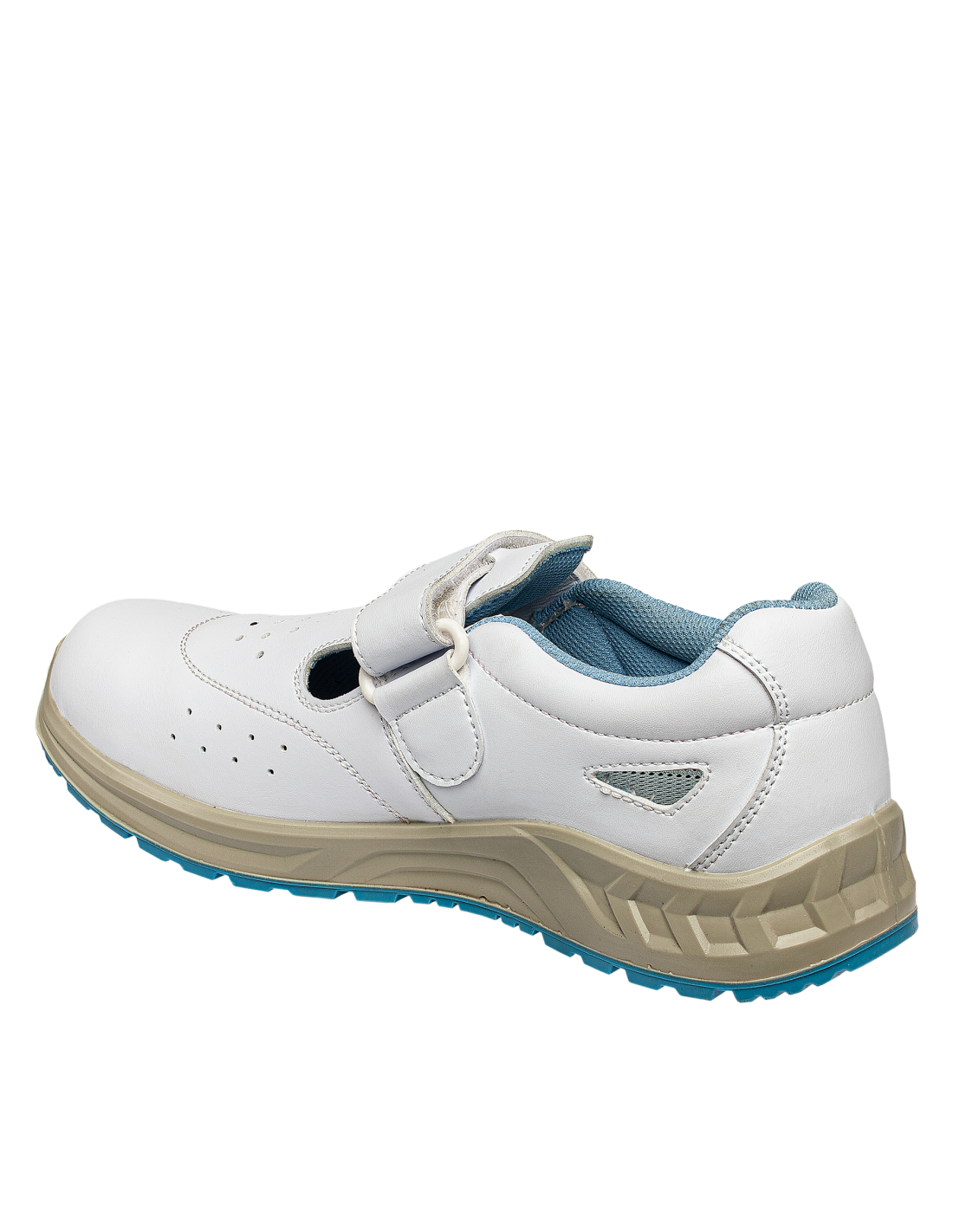 Białe, łatwo zmywalne, antystatyczne buty z właściwościami ESD. Dla większego komfortu podczas długotrwałego noszenia buty te posiadają: absorbcję energii w części piętowej wkładkę z węglem aktywnym (wchłania pot i niweluje nieprzyjemny zapach) perforowaną cholewkę zapewniającą lepszą przepuszczalność powietrza Dla większego bezpieczeństwa, czyli stabilności w pracy, buty wyposażono w podeszwę o właściwościach antypoślizgowych SRC, natomiast metalowy podnosek chroni palce. Szybkie i łatwe zapinanie butów umożliwia rzep. Buty nadają się do suchych środowisk zewnętrznych i wewnętrznych Zalecane zastosowanie: opieka zdrowotna, apteki, hotelarstwo, przemysł spożywczy, stołówki, strefy EPA itp.