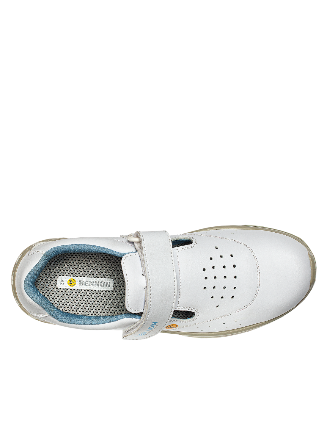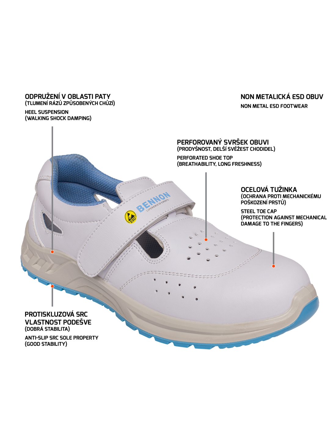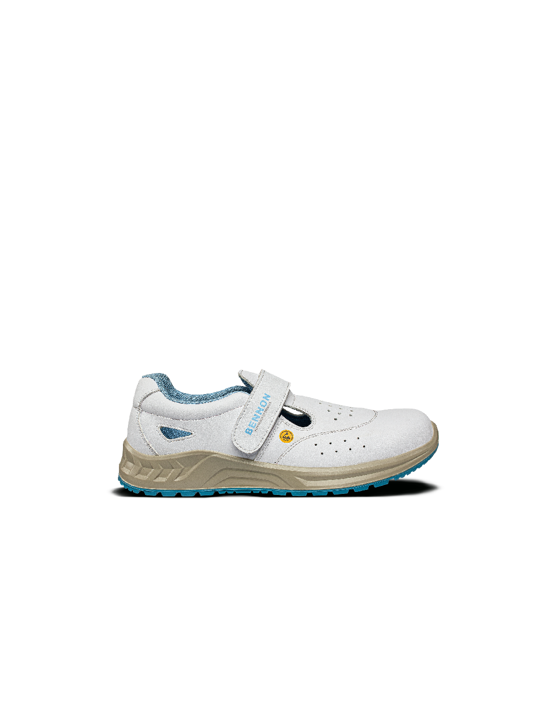 Białe, łatwo zmywalne, antystatyczne buty z właściwościami ESD. Dla większego komfortu podczas długotrwałego noszenia buty te posiadają: absorbcję energii w części piętowej wkładkę z węglem aktywnym (wchłania pot i niweluje nieprzyjemny zapach) perforowaną cholewkę zapewniającą lepszą przepuszczalność powietrza Dla większego bezpieczeństwa, czyli stabilności w pracy, buty wyposażono w podeszwę o właściwościach antypoślizgowych SRC, natomiast metalowy podnosek chroni palce. Szybkie i łatwe zapinanie butów umożliwia rzep. Buty nadają się do suchych środowisk zewnętrznych i wewnętrznych Zalecane zastosowanie: opieka zdrowotna, apteki, hotelarstwo, przemysł spożywczy, stołówki, strefy EPA itp.