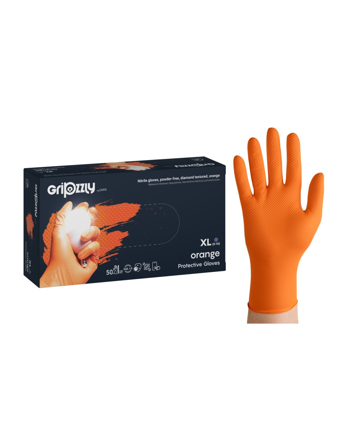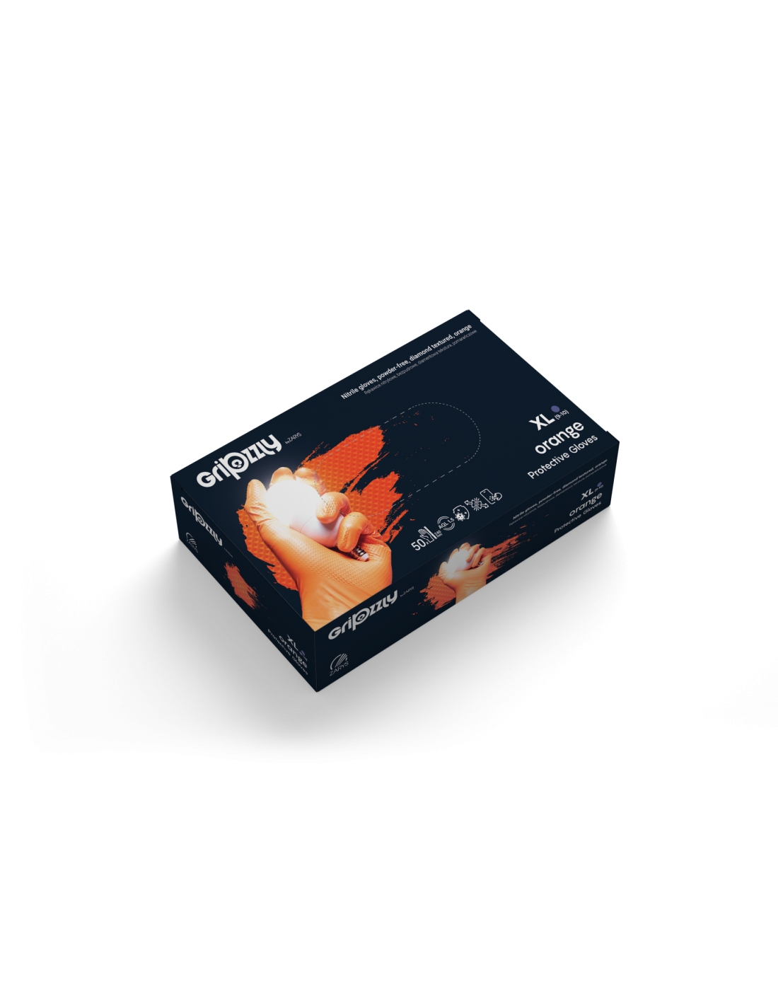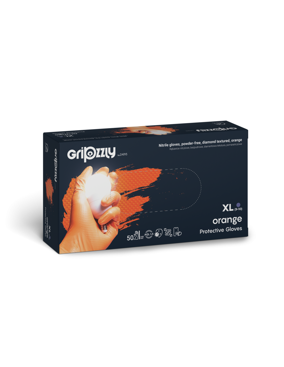 Rękawice Gripzzly wykonane z wysokiej jakości nitrylu, charakteryzują się niezwykłą wytrzymałością oraz grubością, z polimeryzowaną powierzchnią oraz diamentową teksturą na całej powierzchni dłoni i palcach. Wyrób odporny na wirusy, bakterie, grzyby i substancje zawarte w smarach i olejach, dopuszczony do kontaktu z żywnością, przeznaczony do ochrony dłoni przed substancjami niebezpiecznymi.