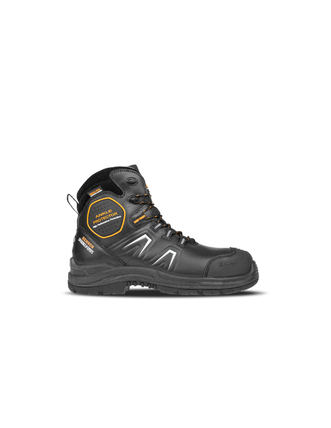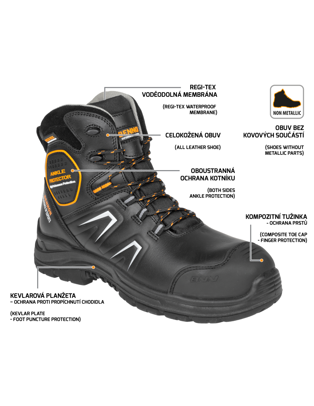 Skórzane obuwie ochronne z ochroną kostki po obu stronach, bez metalowych części, z wodoodporną membraną REGI-TEX®. Buty są wyposażone w dwuskładnikową podeszwę wtryskową PU / guma, nadają się do całorocznego użytkowania w wymagających warunkach na zewnątrz. Elementy odblaskowe na pięcie zapewniają lepszą widoczność.