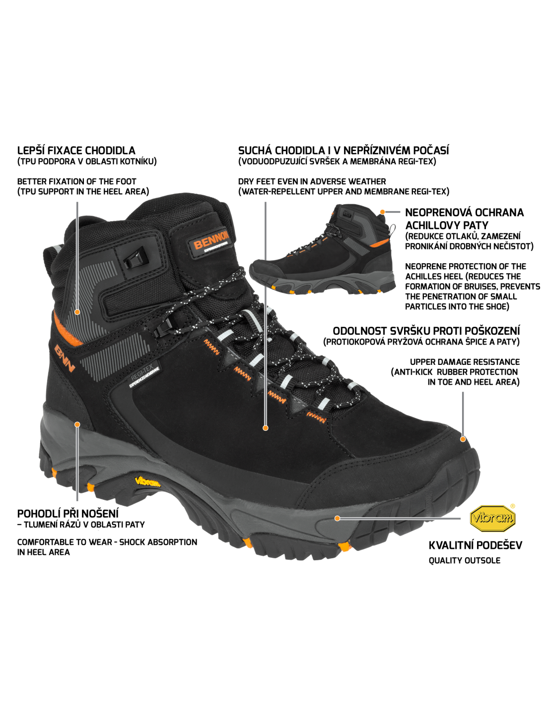 Wytrzymałe trzewiki odpowiednie do zajęć na świeżym powietrzu. Obuwie posiada wodoodporną membranę REGI-TEX, która chroni stopy przed wilgocią. Integralną częścią butów jest również gumowa ochrona palców oraz pięty, a także wzmocnienie z TPU w okolicy kostki, zapewniające lepszą stabilność stopy. W obuwiu zastosowano bardzo praktyczne rozwiązanie - neoprenową ochronę ścięgna Achillesa, ograniczająca powstawanie otarć w tej części stopy oraz jednocześnie zabezpieczająca przed przedostawaniem się drobnych elementów do buta (np. kamyczków) podczas chodzenia. Zalecane użycie: środowisko zewnętrzne