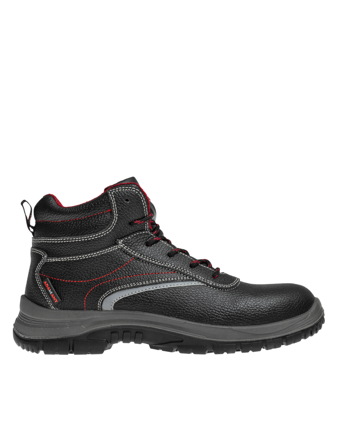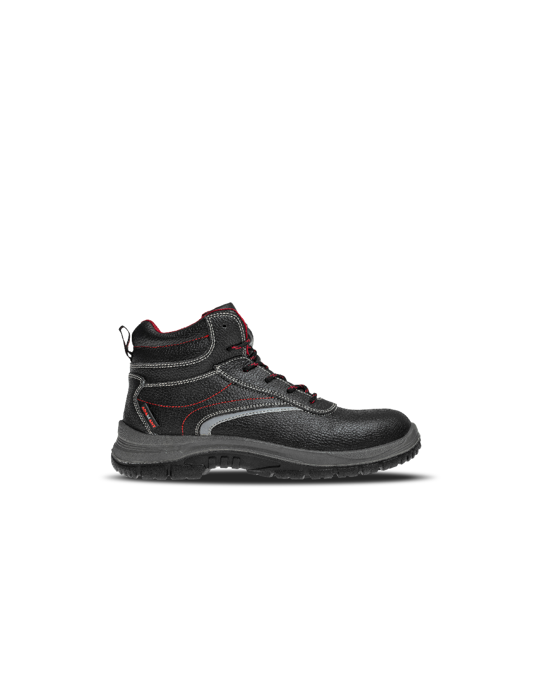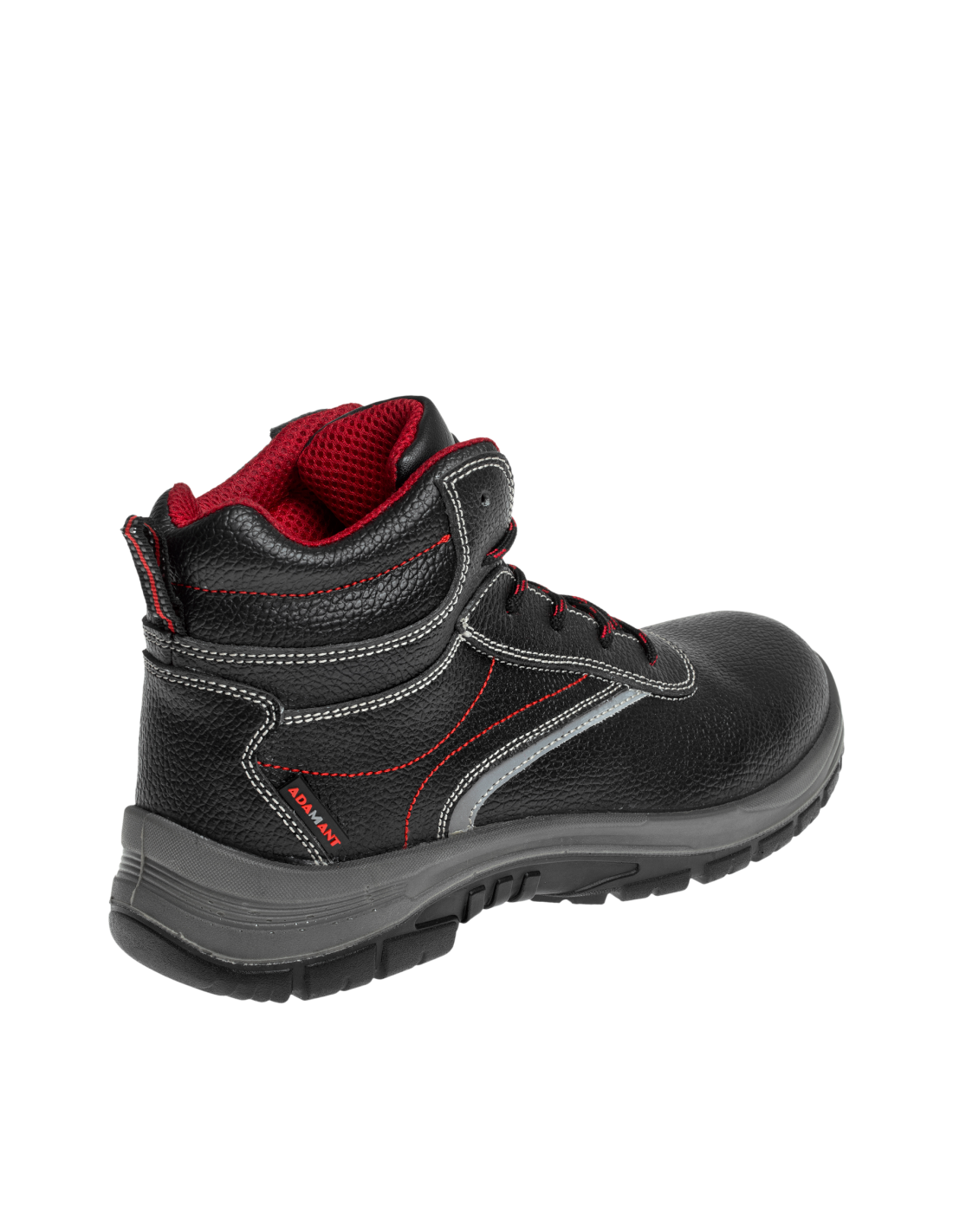 Trzewiki bezpieczne, nie zawierające elementów metalowych, z lekkim kompozytowym podnoskiem i wkładką antyprzebiciową. Odblaskowy pasek na bocznej stronie cholewki.