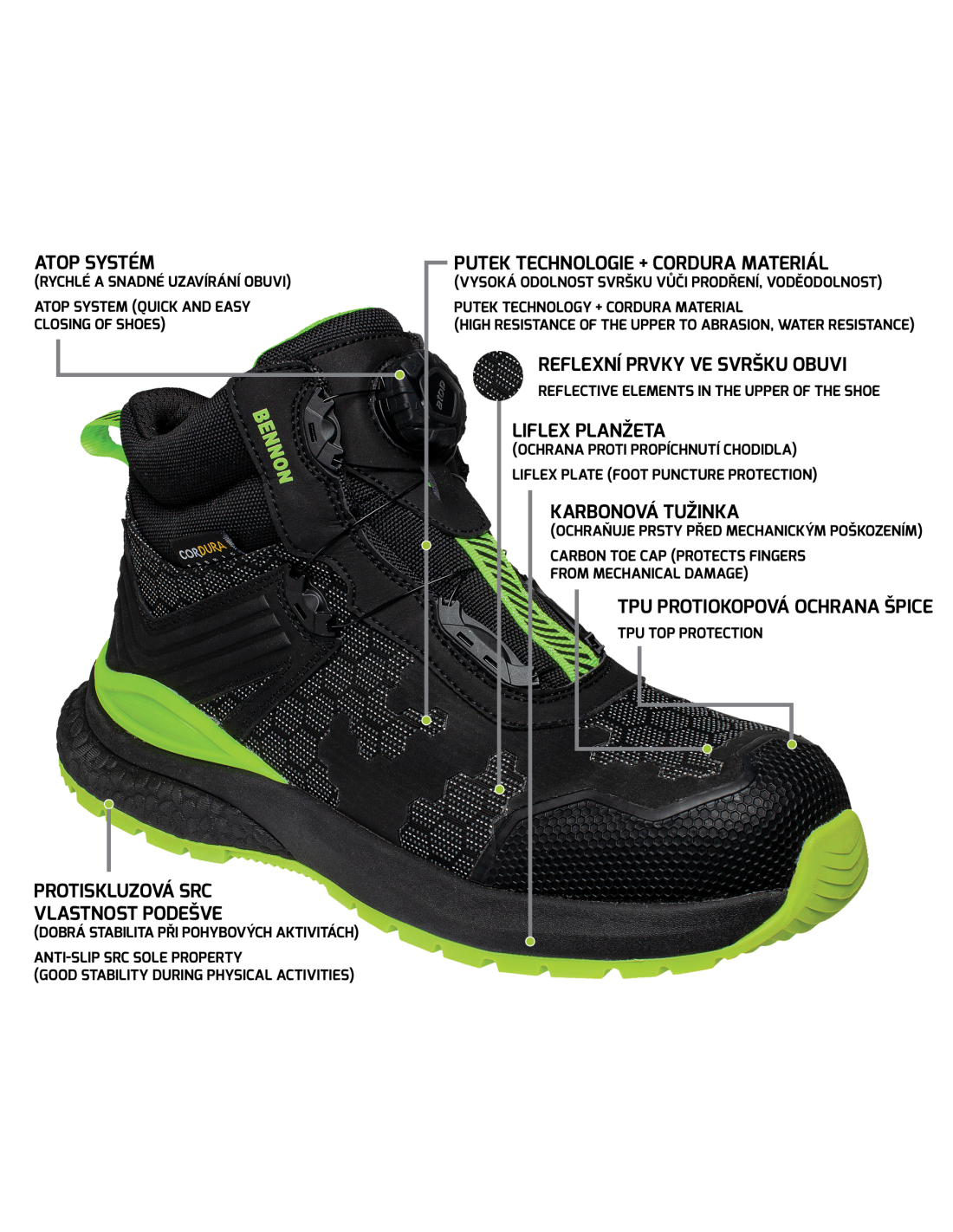 Bardzo wytrzymałe buty robocze do kostki z właściwościami antystatycznymi, odpowiednie do użytkowania na zewnętrz i wewnątrz.   Te buty stanowią rewolucję w butach roboczych, ponieważ łączą wiele przydatnych funkcji w jednym modelu. Charakteryzują się dużą odpornością na uszkodzenia mechaniczne, są wodoodporne, chronią przed ciepłem kontaktowym. Buty posiadają wiele funkcji zwiększających bezpieczeństwo, wyposażone są w anatomiczną wkładkę, która gwarantuje komfort stóp, ich sznurowanie jest łatwe i szybkie.   Szczegółowy opis funkcji: • Wysoką odporność cholewki na ścieranie i jednocześnie wodoodporność zapewnia innowacyjny materiał PUTEK, który składa się z bardzo wytrzymałego poliestrowego wnętrza i poliuretanowej osłony oraz wykorzystanie materiału CORDURA. Te dwa materiały wydłużają żywotność butów. • Powłoka TPU zapewnia ochronę czubka buta przed mechanicznym uszkodzeniem cholewki • Szybkie i łatwe zamykanie butów za pomocą systemu ATOP – wkładasz buty, przekręcasz zacisk i ruszasz. • Wzmocnienie TPU w obszarze pięty • Szersza i przedłużona podeszwa w obszarze pięty zapewnia dobrą stabilność • Podeszwa jest odporna na ciepło kontaktowe oraz działanie olejów i smarów.   • Parametry, które gwarantują bezpieczeństwo podczas użytkowania:  Lekki i bardzo mocny czubek z włókna węglowego, który chroni palce przed uszkodzeniami mechanicznymi (np. spadający przedmiot itp.)  Mocna i elastyczna wkładka antyprzebiciowa LIFLEX chroni spód stopy przed przebiciem, a mocna gumowa podeszwa przed ciepłem kontaktowym.  Antypoślizgowa podeszwa SRC zapewnia dobrą stabilność podczas aktywności fizycznej.  Elementy odblaskowe w postaci włókien zawartych w wierzchnim materiale PUTEK zapewniają lepszą widoczność w półmroku i ciemności.  Komfort zapewnia anatomicznie ukształtowana wkładka ACTIVA, która została stworzona, aby wspierać łuki podłużne i poprzeczne, a dzięki miękkiej wyściółce w obszarze pięty, uderzenia w kość pięty są tłumione. Wkładka jest wykonana z wykorzystaniem węgla aktywnego, który pochłania zapachy i wchłania pot.   Zalecane zastosowanie: prace wewnątrz i na zewnątrz, pozostałe prace na powierzchniach utwardzonych