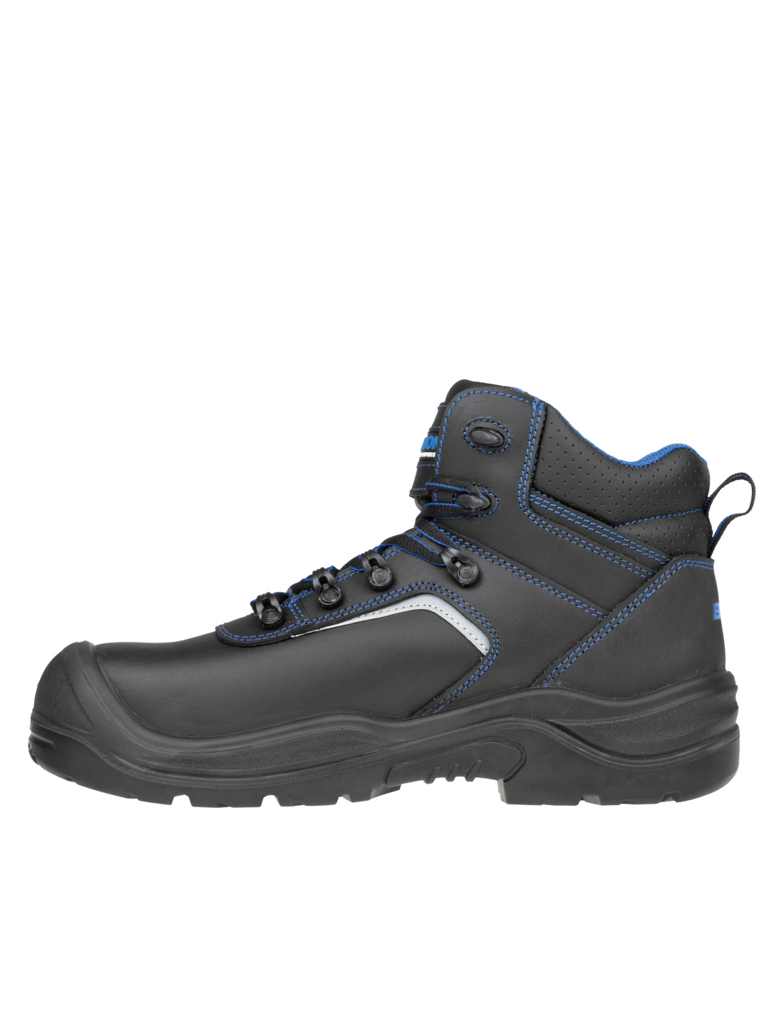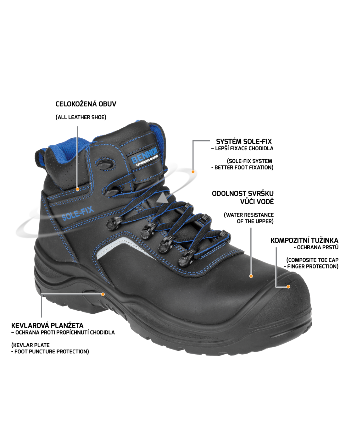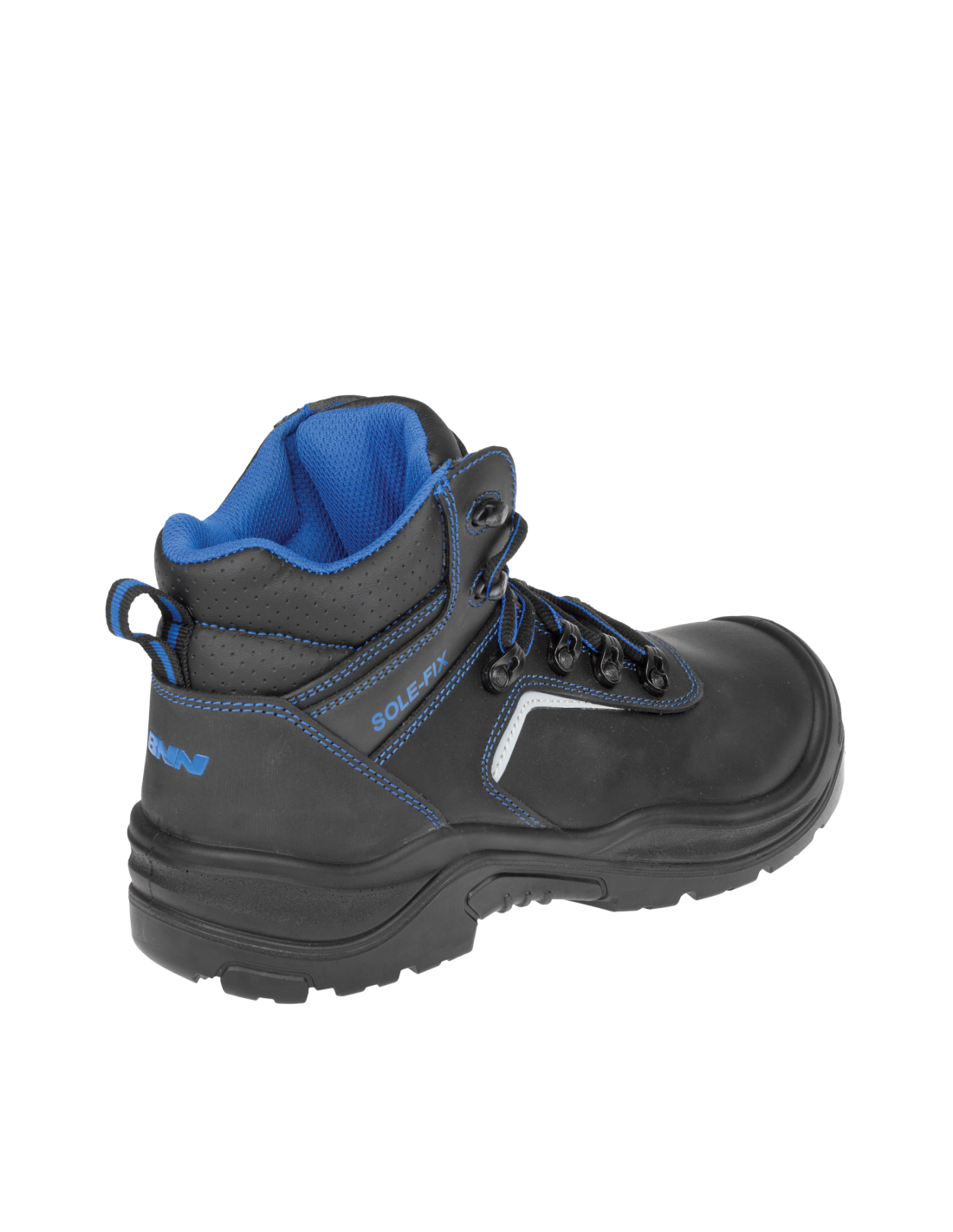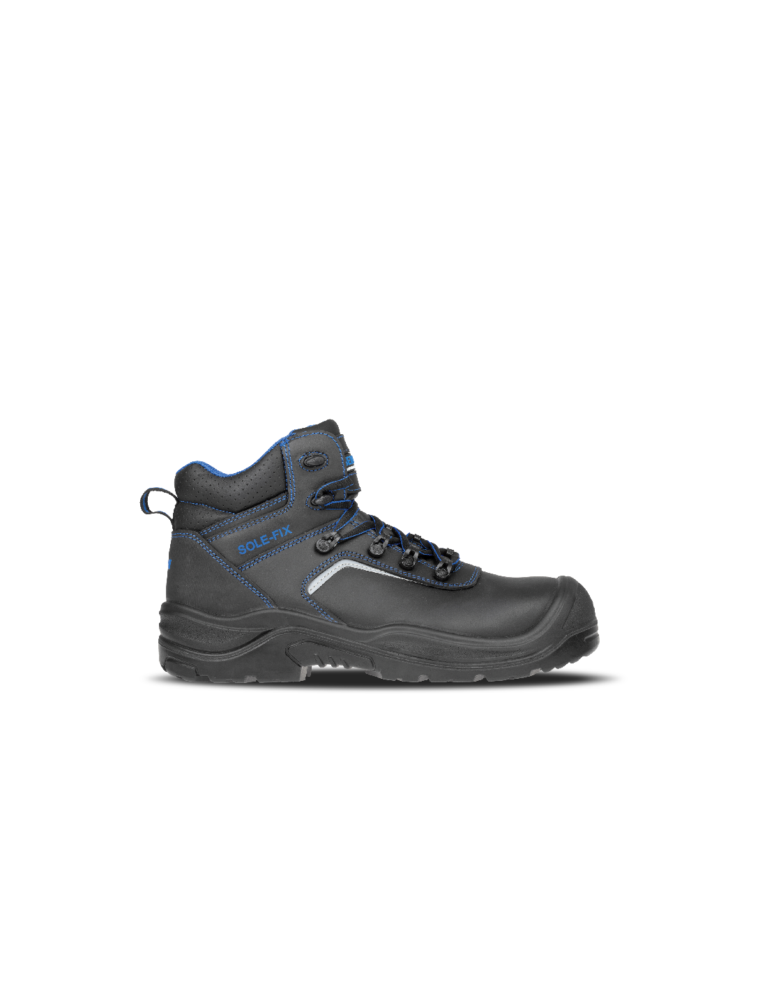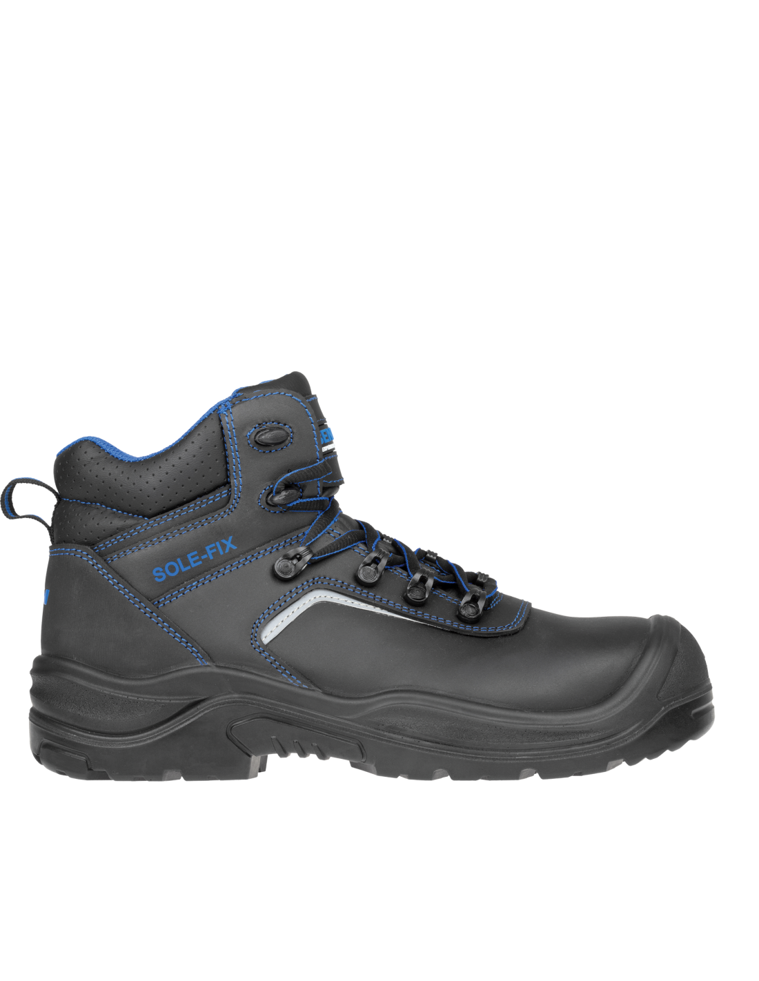 Bezpieczny skórzany trzewik z oznaczeniem S3. W obszarze kostki obuwie jest wyposażone w system SOLE-FIX, który zapewnia lepsze dopasowanie. Obuwie posiada element odblaskowy dla lepszej widoczności, wkładkę antyprzebiciową z kevlaru oraz kompozytowy podnosek.